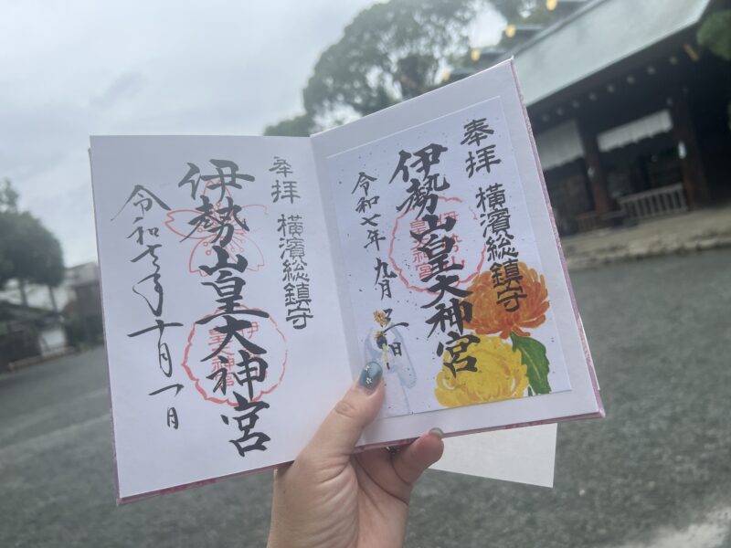 伊勢山皇大神宮の御朱印は、季節のデザインものがあるときは右のような書き置きをいただきますが、基本的にはお書き入れしていただいています。