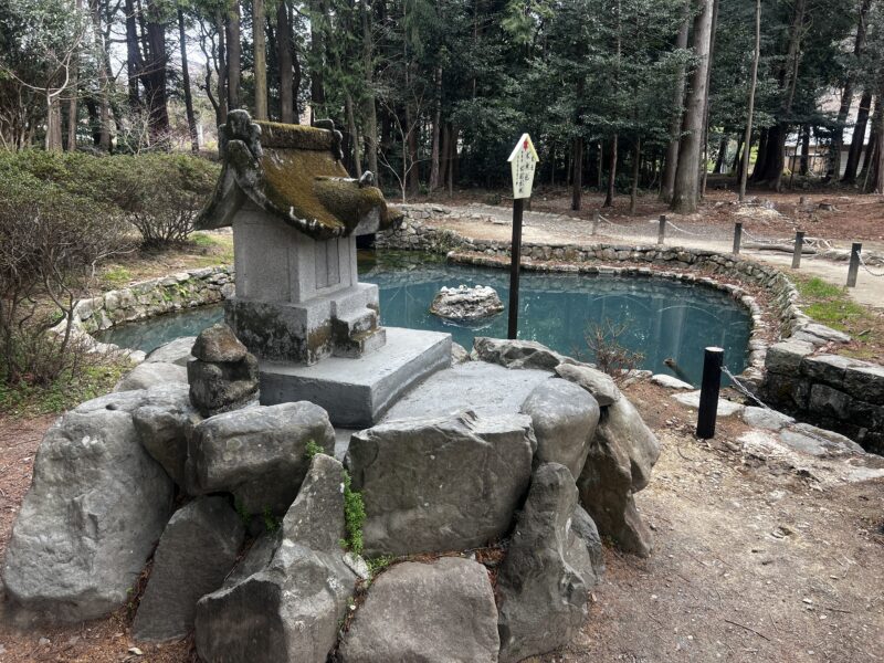 水神社(すいじんじゃ)の向こうには、青い心願の鏡池があり、その先にメガネ橋が架けられています。(写真がなくてごめんなさい)ドイツの技術を活かした石橋です。