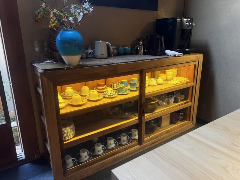 大きなテーブルの横にはカップ&ソーサーがが置かれた収納棚。照明でライティングされていて、いい雰囲気ですよね。