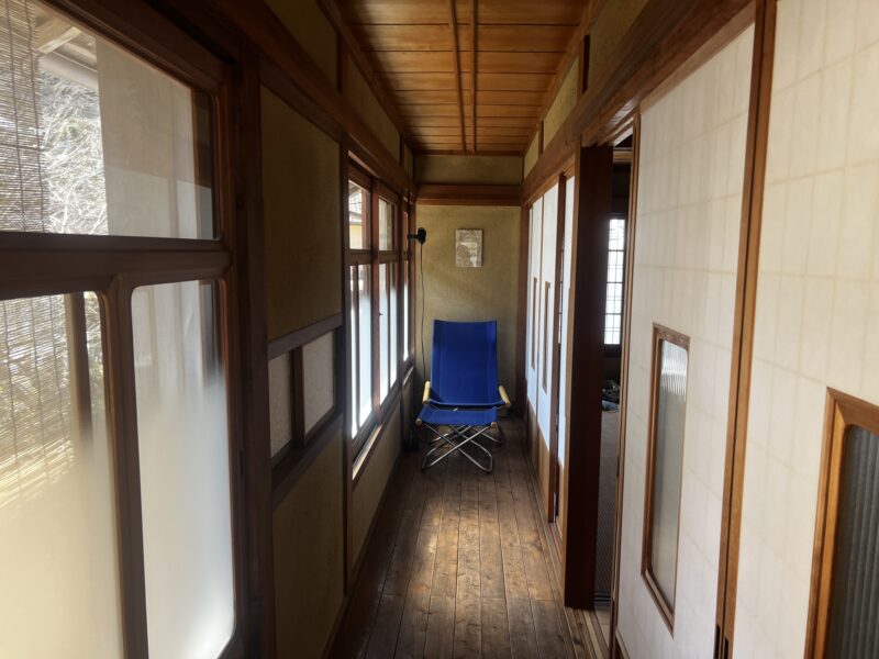 階段を上がると、正面に廊下(縁側)があり、奥にハイスタイルチェアが置かれています。お天気の良い日に外の景色を眺めながら、ゆったりとくつろげます。