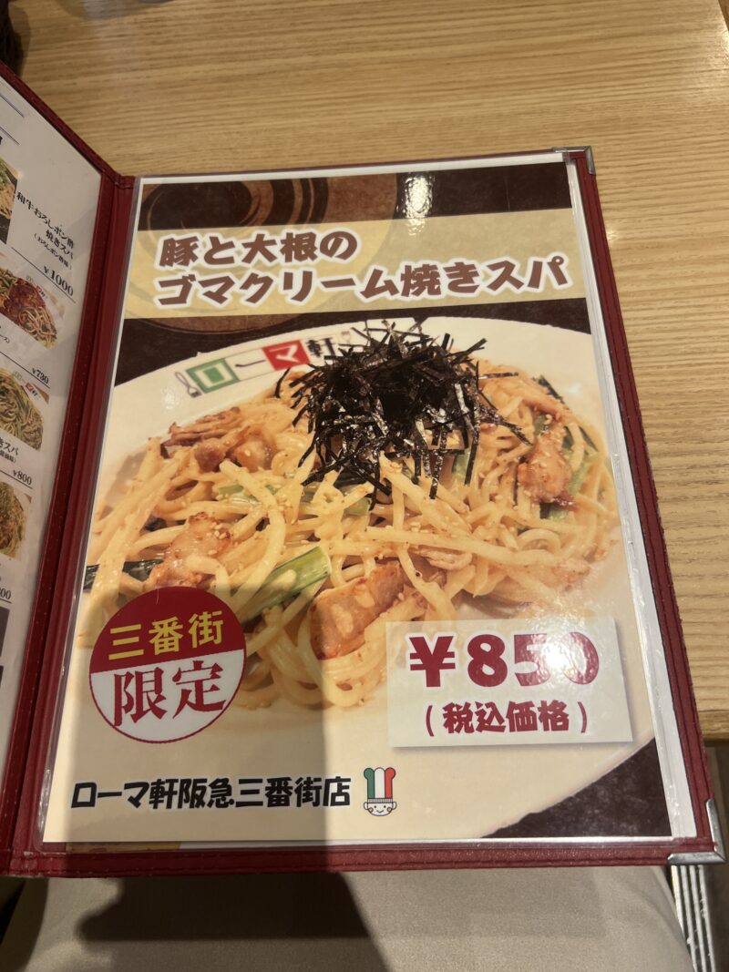 初訪問だし、有名な焼きナポリタンもいいなと思ったんですが、せっかくなので三番街店限定の豚と大根のゴマクリーム焼きスパ(税込850円)を注文してみました。
