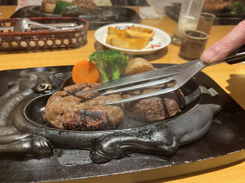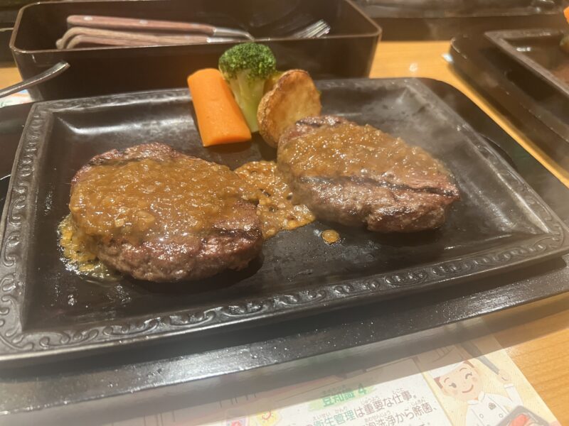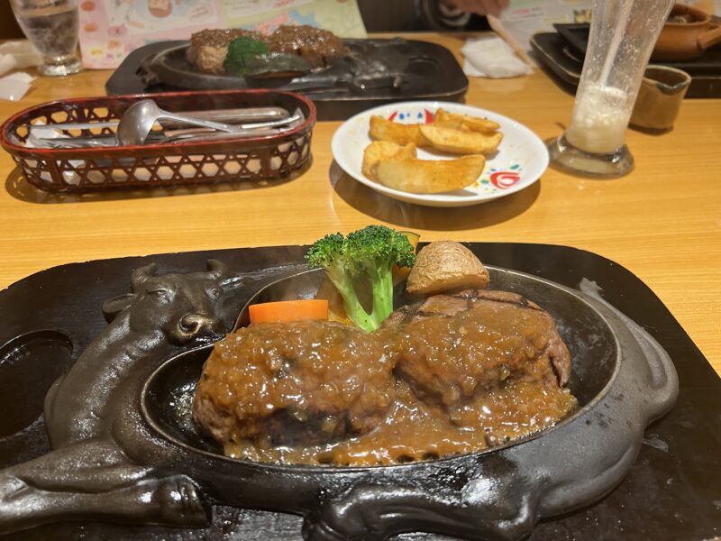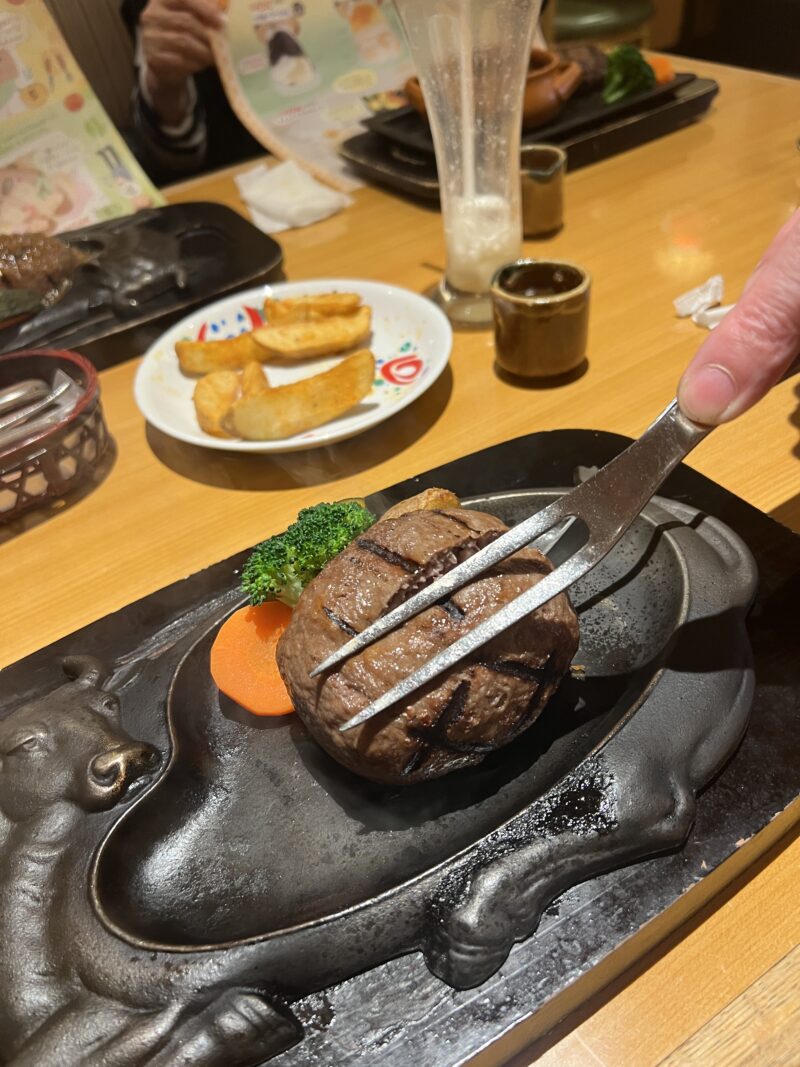 げんこつハンバーグより小さくて、火の通りもよいと思うので、次はおにぎりハンバーグを「よく焼き」せずに注文してみたいと思います。