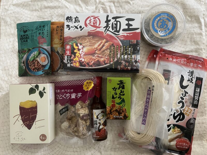 半田そうめん、讃岐うどん、徳島ラーメン、鳴門金時スイートポテト、蜜芋、すじあおのり、いくら醤油、阿波尾鶏のレトルト2種、青とうがらし味噌、福寿醤油の醤油セットとみりん、クーヘンのスコーン、上勝のポン酢、生しいたけ、柑橘1袋、梅干し、きくいも(乾燥)、プリズムラボの焼き菓子